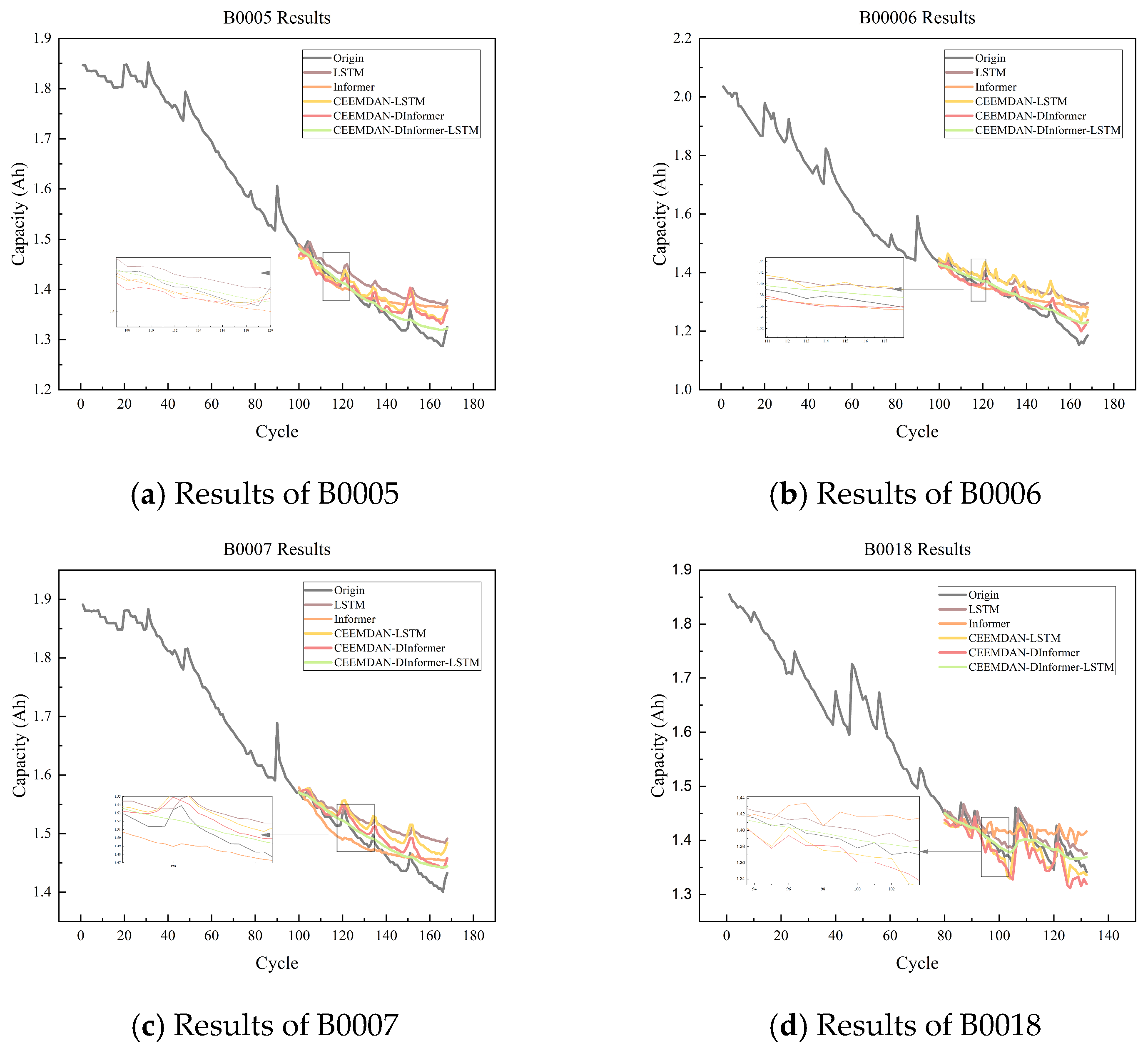 - Liu, B.; Ji, C.; Cao, L.; Wu, X.; Duan, Y. Prediction of Remaining Service Life of Lithium-Ion Batteries Based on Complete Ensemble Empirical Mode Decomposition with Adaptive Noise and BiLSTM-Transformer. Power Syst. Prot. Control 2024, 52, 167–177. [Google Scholar]