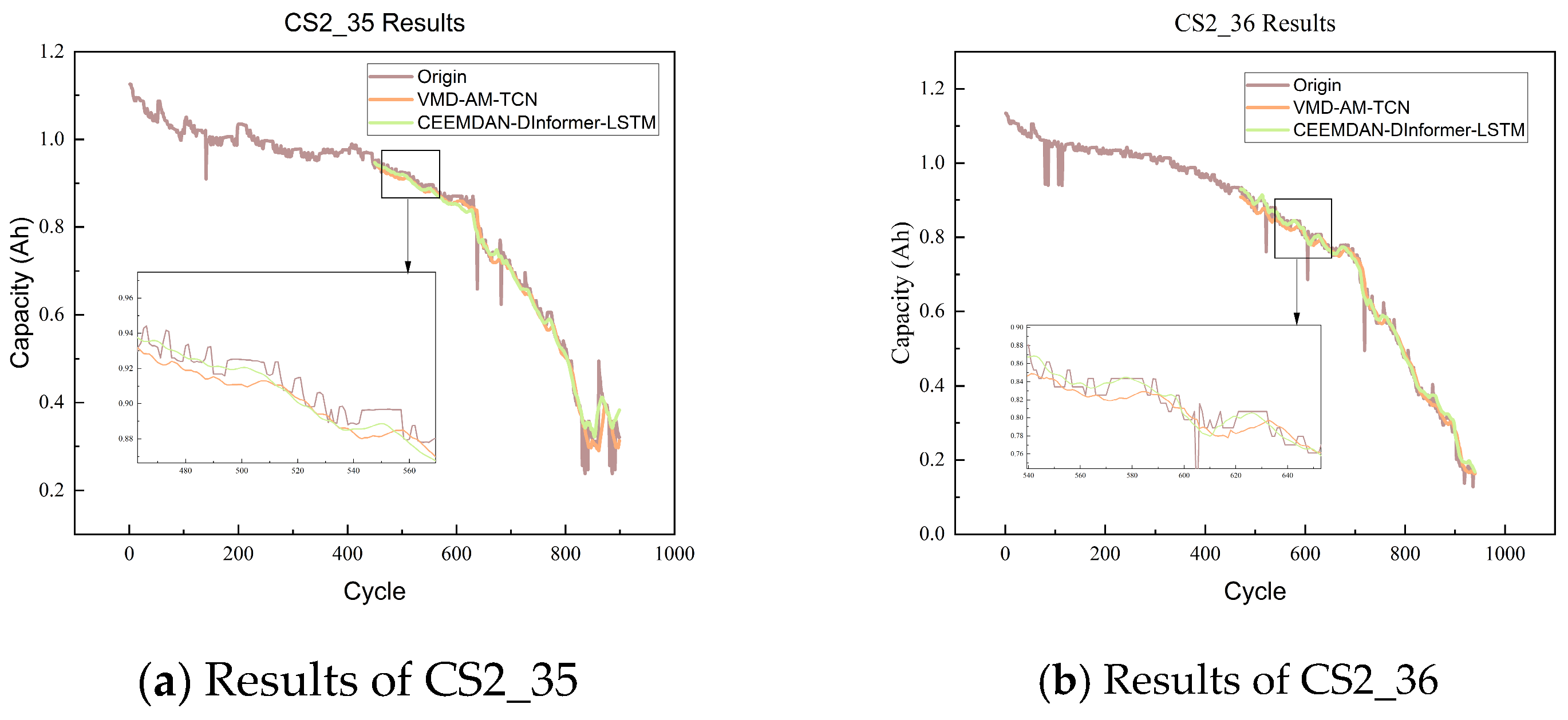 - Wang, S.; Ma, H.; Zhang, Y.; Li, S.; He, W. Remaining useful life prediction method of lithium-ion batteries is based on variational modal decomposition and deep learning integrated approach. Energy 2023, 282, 128984. [Google Scholar] [CrossRef]