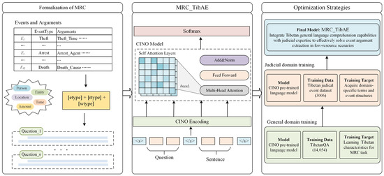 The task formalization module transforms the traditional event argument extraction tasks into structured question-answering problems. Through carefully designed question templates, it explicitly embeds event type and argument information, guiding the model to focus on extracting key event elements. The MRC_TibAE architecture concatenates the question with the event sentence and employs multi-head self-attention to model complex dependencies between them; then, the core features are processed using a feedforward neural network and residual connections and normalization layers; finally, the start and end positions of the target segment in the text are predicted through the normalized Softmax classification layer. An optimization strategy for low-resource languages addresses the challenge of data scarcity. The model is trained on the TibetanQA dataset for general-purpose Tibetan machine reading comprehension, acquiring basic Tibetan language comprehension capabilities. It is then fine-tuned on a specific judicial dataset. This two-stage training approach effectively leverages a wider range of general-purpose datasets, establishing foundational Tibetan language comprehension capabilities adapted to the specialized judicial domain.