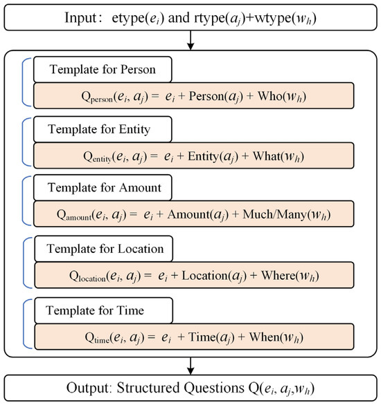 Here, denotes the question template, represents the event type, represents the argument role, refers to the type of interrogative word, and Template represents the question template generation function.