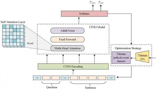 Based on the MRC paradigm following task reformulation, this paper proposes the MRC_TibAE model (Machine Reading Comprehension Model for Tibetan Judicial Event Argument Extraction). The model’s overall architecture is depicted in Figure 3 and includes three key components: the encoding layer, the interaction layer, and the prediction layer. The model employs the minority language pre-training model CINO as the basic encoder. Using self-attention, the model effectively encodes the semantic interplay between the question and the event sentence. Finally, a position prediction module is used to locate and extract the event arguments.