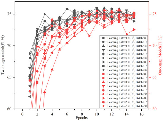 Results show that different hyperparameter combinations lead to significant differences in convergence speed and performance. A learning rate that is too low often leads to slow model convergence, making it difficult to reach optimality within a limited number of epochs. A learning rate that is too high leads to rapid initial improvement but is accompanied by significant fluctuations and instability. Comprehensive analysis shows that the combination of a learning rate of 2 × 10−5 and a batch size of 8 achieves the best balance between convergence speed, stability, and final performance. Therefore, this configuration was ultimately selected as the core parameter for subsequent experiments.