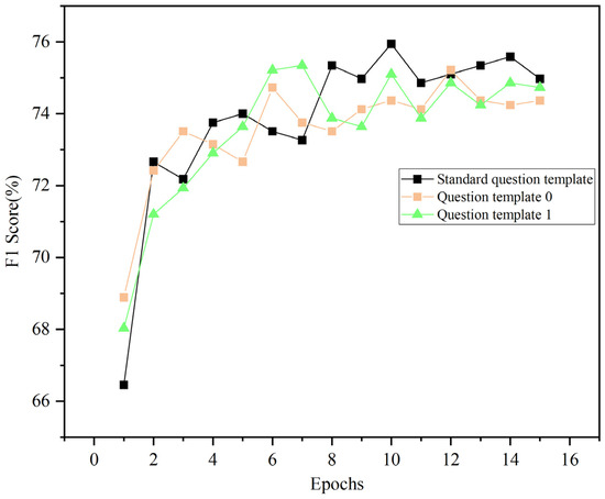 This paper designed three different question templates for comparative experiments. Figure 6 shows the performance of the three question templates. Question Template 0 only contains event argument role information, Question Template 1 adds interrogative words and uses natural language questioning, and the standard question template is the template proposed in this paper.