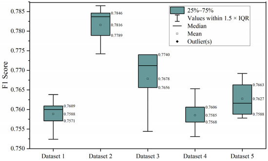 This study conducted experiments on five randomly partitioned datasets, setting five random seeds in each partition, for a total of 25 experimental groups. According to the experimental results, the proposed model attains an average F1-score of 0.7659, with a standard deviation of 0.0101 and a 95% confidence interval of [0.7617, 0.7701]. This indicates that the results are concentrated and have low fluctuations, demonstrating good stability and reliability. Regarding the performance of different datasets, the best result was observed on Dataset 2, with an average F1-score of 0.7816, while the performance of Datasets 1 and 4 was relatively low but still within a reasonable range. Although there were some differences between the results of each group, they remained at a high level overall, further verifying the robustness of the proposed method under different data conditions.