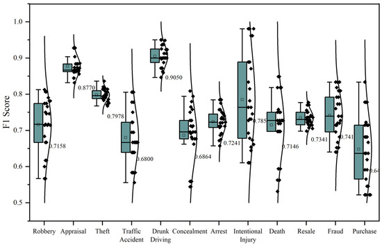 From a stability perspective, events such as “Drunk Driving” and “Theft” exhibit excellent stability (variance ≤ 0.001), indicating that the model’s outcomes for these events are more consistent and robust. In contrast, performance on events such as “Intentional Injury” and “Purchase” are more dispersed, indicating that the model is more significantly affected by data partitioning and random factors in these events, resulting in less stable results.