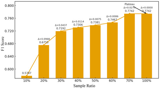 For a thorough examination of the proposed method’s adaptability under limited-resource settings, experiments were performed by randomly sampling the training dataset at different ratios: 10%, 20%, 30%, 40%, 50%, 60%, 70%, and 100%. Figure 9 presents the experimental results.