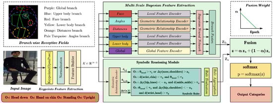 These features are concatenated with the raw keypoint coordinates to form a rich, multi-dimensional feature vector , where D is the total dimensionality. This vector serves as the input for the subsequent processing in our framework. It is used simultaneously by both the multi-scale Bayesian feature extraction and processing module and the symbolic reasoning module.