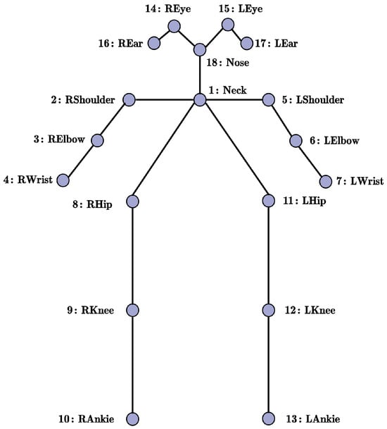 - Automated Keypoint Extraction: We used OpenPose (https://github.com/CMU-Perceptual-Computing-Lab/openpose accessed 16 August 2025) to extract 18 COCO-format 2D keypoints (including interpolated neck point) for each frame. Frames with missing or severely occluded keypoints (e.g., >4 joints undetected) were automatically discarded.