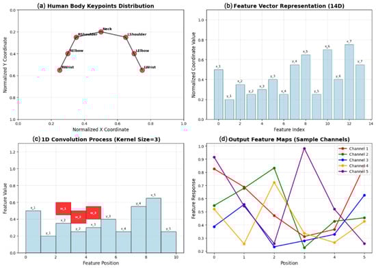 Local feature extraction via 1D convolution for upper body keypoints. (a) Spatial layout of seven upper-body joints. (b) Corresponding 14-dimensional input feature vector. (c) One-dimansional convolution with kernel size along the ordered keypoint sequence. (d) Example output feature maps from multiple channels, capturing localized spatial patterns.