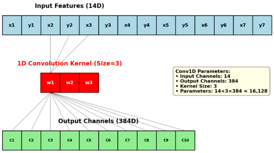 The architectural details of the LFE module are illustrated in Figure 5. The 14D input is convolved using a kernel of size 3 to produce 384 output channels, yielding a total of learnable parameters. This design balances expressiveness and efficiency, allowing the model to represent complex posture patterns without excessive computational cost.