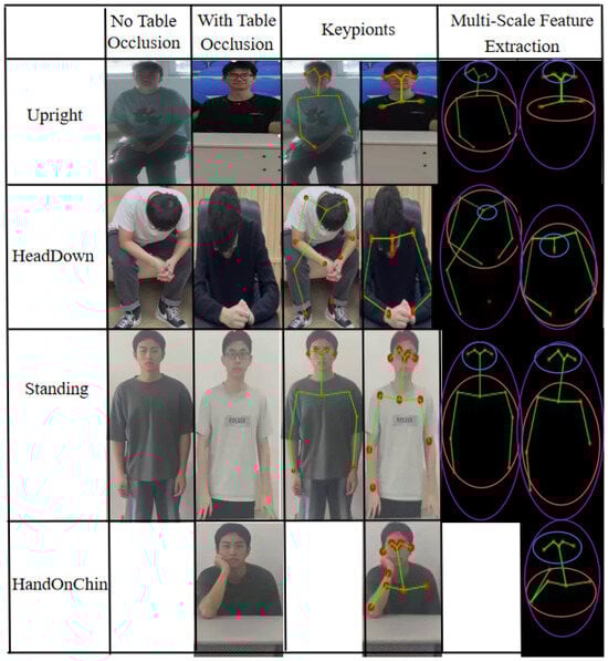 To address problems caused by insufficient data, we constructed a new sitting posture dataset named USSP. This dataset is specifically designed to reflect the diversity of postures, environmental variations, individual differences, and camera configurations encountered in natural academic environments such as classrooms, study rooms, and dormitories, where desks and chairs often partially occlude the lower body, especially the legs and hips. Unlike existing public posture datasets that frequently focus on controlled laboratory settings or generic human actions, USSP emphasizes ecological validity, capturing data under realistic conditions with minimal constraints on participants’ behavior.