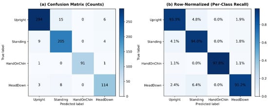 Detailed class-wise performance is summarized in Table 13. The model performs particularly well on HandOnChin and Upright, achieving F1-scores of 78.05% and 74.34%, respectively. In contrast, lower recall on Standing indicates challenges with more ambiguous or variable pose categories under few-shot constraints.