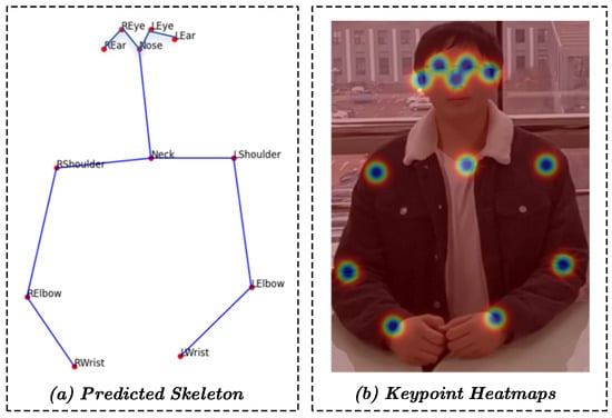 Moreover, after additional processing and applying the MSBN-SPose model, we can generate heatmap visualizations directly on the original RGB images, as depicted in Figure 9b. This heatmap highlights the regions where the model focuses its attention, particularly around key facial and upper body parts, aligning well with the keypoint-based skeletal structure. Such visualizations provide an intuitive interpretation of the model’s decision-making process and confirm that the model leverages both spatial and visual features effectively.