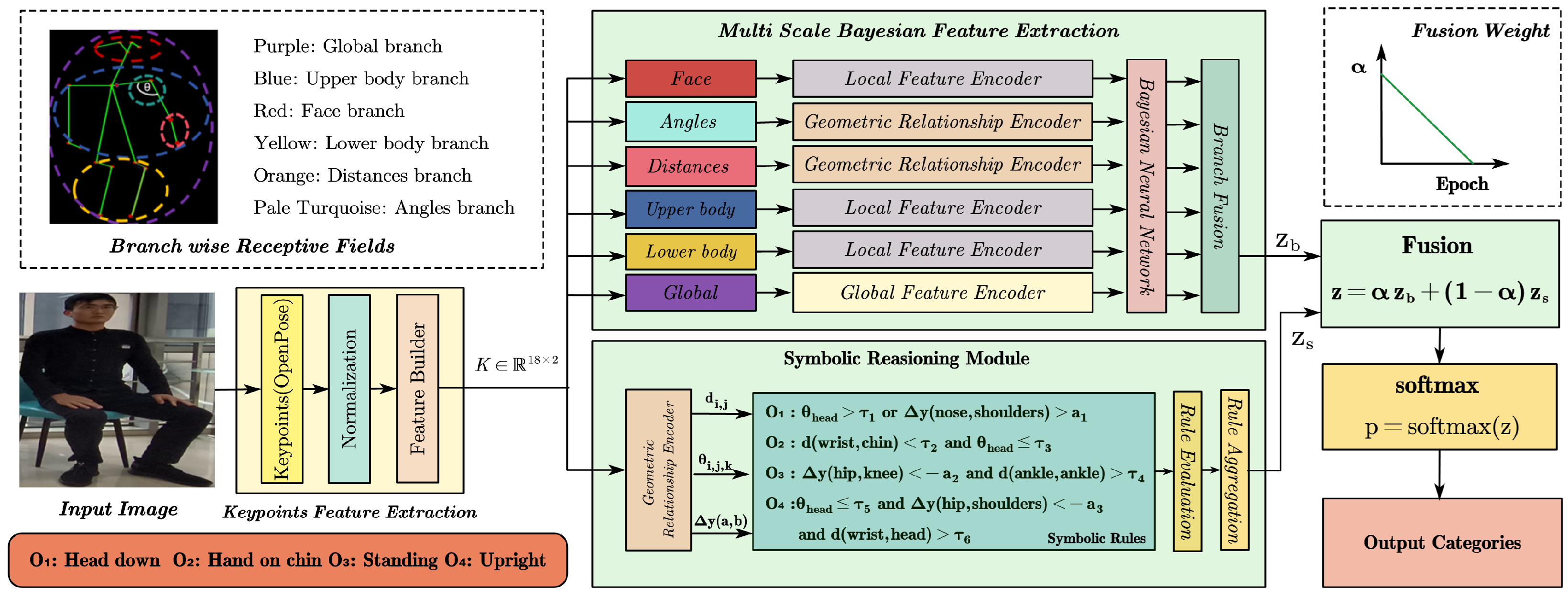 To robustly characterize sitting postures under diverse conditions, we propose a multi-branch, multi-scale feature extraction strategy. Specifically, we extract and encode (1) global coordinate features capturing holistic body layout, (2) local region features emphasizing part-level dynamics, and (3) geometric relationship feature modeling relative to spatial configuration. Each pathway is processed through a dedicated neural module to produce semantically rich embeddings for subsequent Bayesian fusion.