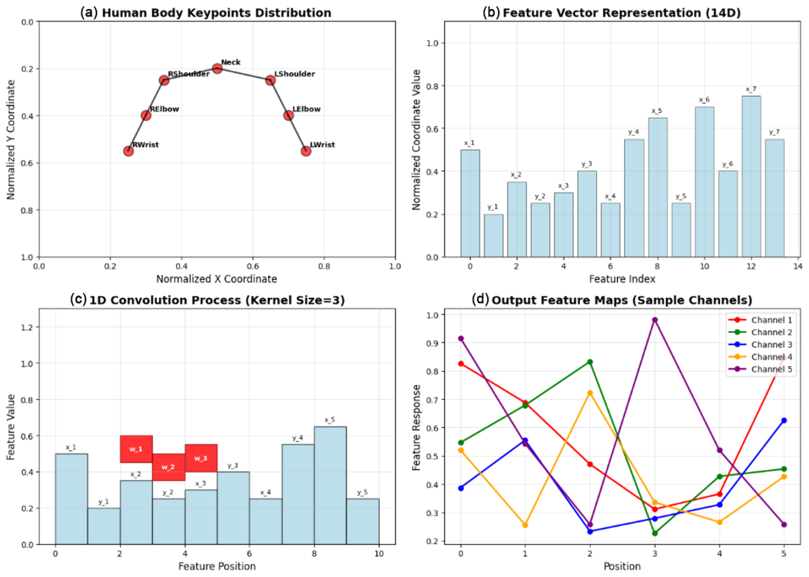 The first stage of our framework involves extracting raw 2D human pose keypoints from input images. We utilize OpenPose to detect 18 key points, which are subsequently normalized by centering at the pelvis joint and scaling by torso length to ensure scale invariance. This step produces a keypoint coordinate matrix X R N × 2 , where N = 18 . The extracted keypoints serve as the foundation for subsequent feature engineering. As shown in Figure 2.