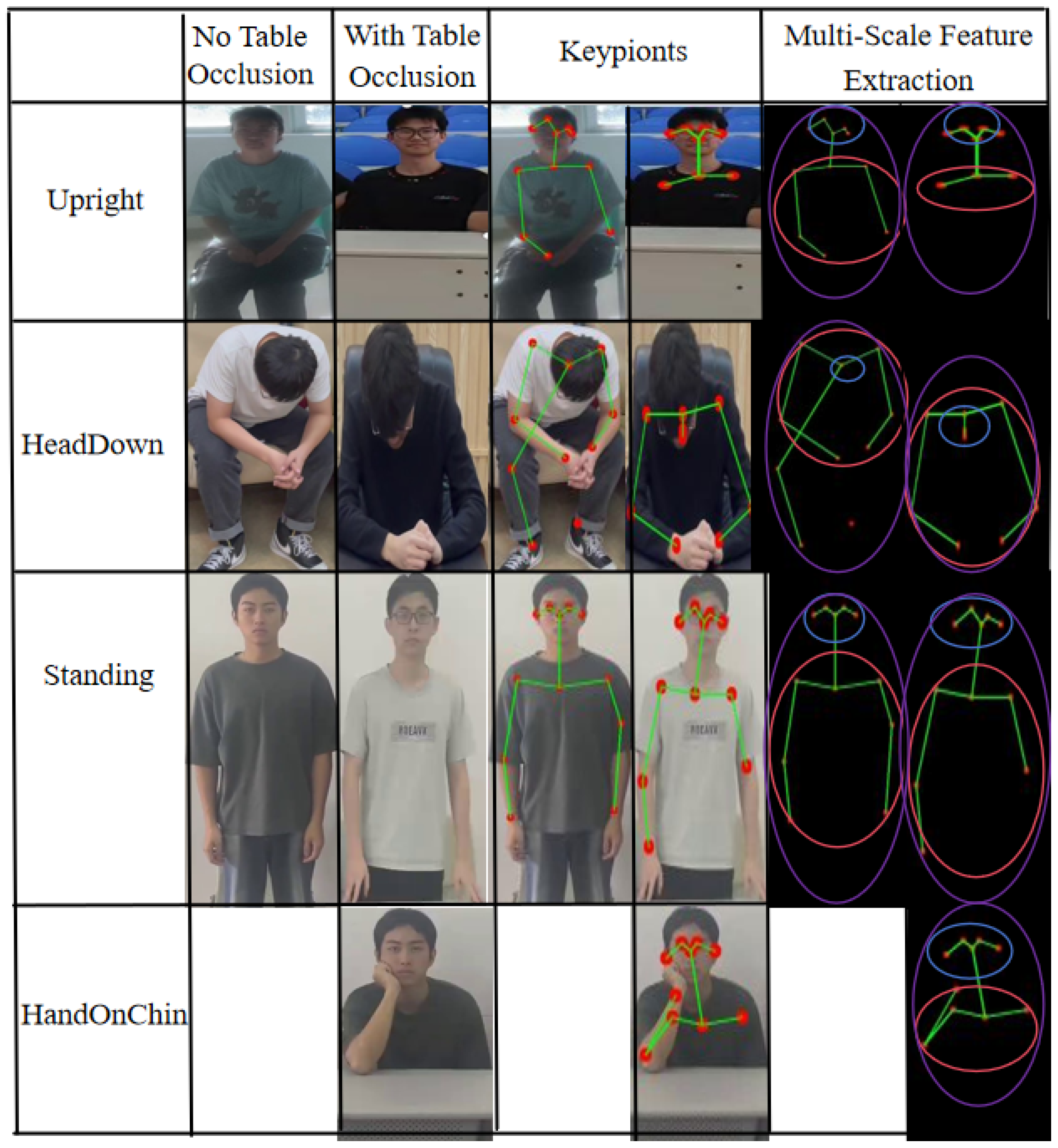 Moreover, most existing methods employ single-scale feature modeling, neglecting the multi-scale nature of sitting posture differences—both local (e.g., hand movements) and global (e.g., spinal alignment). While multi-scale networks such as HRNet [25,26] have achieved success in pose estimation, systematic exploration of effective multi-scale structural information fusion remains lacking in sitting posture classification tasks.
