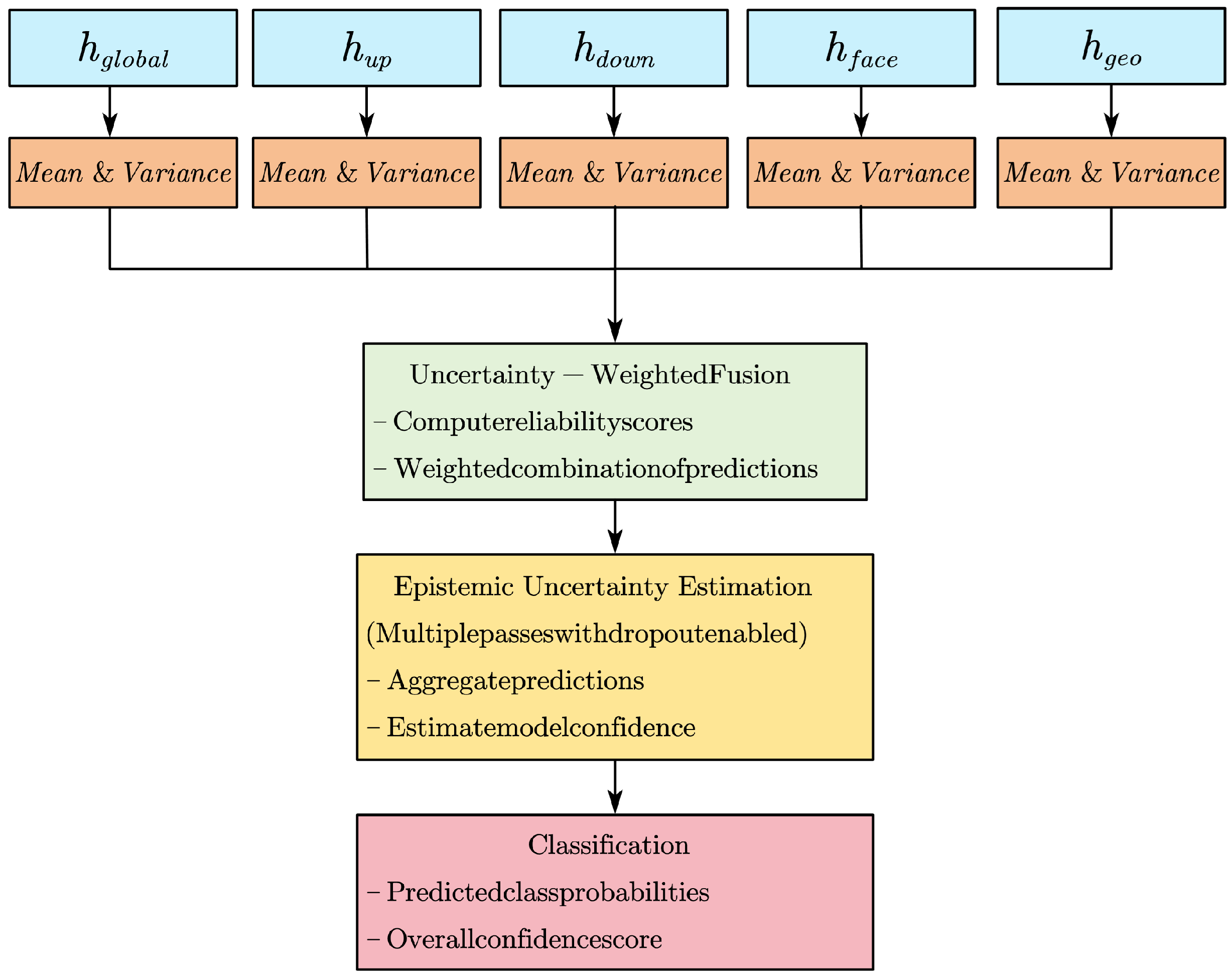 Table 10. Single-stream (Single-Scale) and cumulative multi-stream combinations for the Bayesian fusion module (macro-averaged, %). Starting from Global, streams are added stepwise (G→U→L→F→Geom). The full model (All) achieves the best performance; notably, adding Geometric brings the largest stepwise gain (+4.36 pp Macro-F1).
