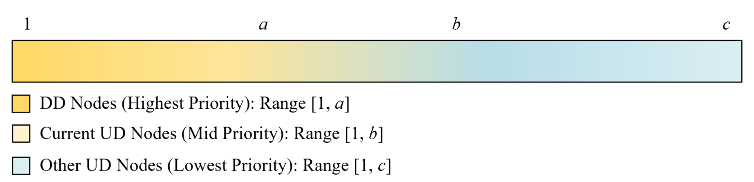 - When a DD node wins TDC (Case 2: DD→AP): The current DD node receives the highest priority () to satisfy its own downlink demand. Other DD nodes have medium priority (), while all UD nodes have the lowest priority ().