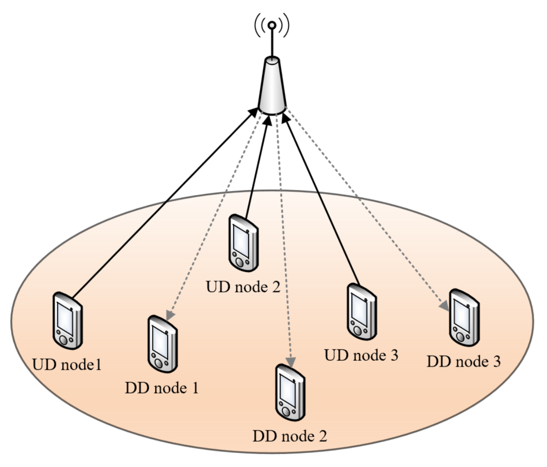 - When AP targets a UD node (Case 3: AP→UD): The targeted UD node has the highest priority () to find an uplink partner. Other UD nodes have medium priority (), and DD nodes have the lowest priority ().
