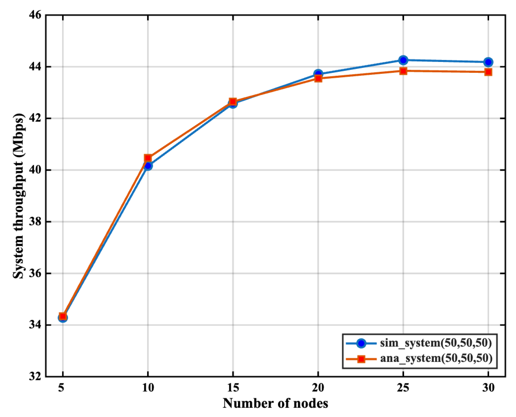 - Excellent Model–Simulation Agreement: There is a very close match between the analytical curve and the simulation data points across the entire range of network sizes. For instance, at 15 nodes, the analytical model predicts a throughput of 42.65 Mbps, while the simulation yields a result of 42.58 Mbps, demonstrating a negligible deviation. This consistency validates the accuracy of our theoretical model in predicting the protocol’s performance, even in larger-scale scenarios.