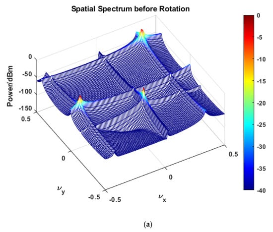 To obtain the optimal angular offset , a two-dimensional search is performed within a certain range. When the -th element in is reduced to its highest form, the corresponding can be found, represented by Equation (24), where is the -th column of , and is the -th column of . Simulation results are shown in Figure 2. With the array configuration set as half-wavelength spacing array element, spatial spectrum analysis is performed for three independent targets with angular information , and , respectively. Figure 2a,b show the spatial power spectrum distribution before and after two-dimensional discrete Fourier transform (2D-DFT) processing, where the colormap range is −40 dBm to 0 dBm, and the horizontal and vertical coordinates correspond to the normalized spatial frequency components: