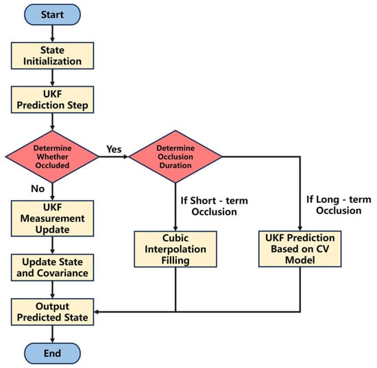 Figure 3 illustrates the basic workflow of the algorithm presented in this paper. After the system obtains the initial state through parameter estimation, UKF prediction is performed. Simultaneously, target occlusion is determined by analyzing the Line-of-Sight (LoS) visibility between the UAV and the base station. If no occlusion is detected, the system has observational input, and a UKF measurement update is performed, along with updating the system state and covariance. If the occlusion duration is short (e.g., less than 3 s), cubic interpolation is employed to maintain state continuity, and missing values are filled using historical observation data. Its error is smaller compared to using only the Unscented Kalman Filter (UKF) prediction process. However, because it assumes the trajectory remains smoothly continuous during occlusion, errors accumulate rapidly when the occlusion duration is long, and the trajectory prediction deviation significantly increases. Therefore, if the occlusion duration is long, the system switches to a Constant Velocity (CV) model for prediction, and the predicted state is finally output.
