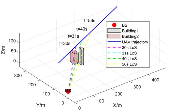 A three-dimensional Cartesian coordinate system is constructed in Figure 1 to establish the spatial geometric model of the UAV-obstacle, which intuitively presents the relative pose relationship between the UAV and the static ground obstacles. In the figure, horizontal terrain is represented by the plane, and the -axis extends vertically upward. Two types of typical obstacles are included in the figure: short-term occlusion is simulated by vegetation obstacles, and long-term occlusion is simulated by building obstacles. The spatial geometric relationship between the unmanned aerial vehicle (UAV) and obstacles is indicated by two-color path lines. The line-of-sight (LOS) propagation path is represented by a solid green line, while the path obstructed by obstacles is represented by a dashed red line.