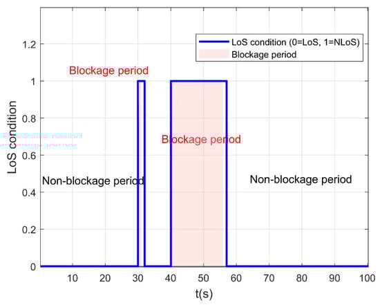 This paper considers an urban environment, as shown in Figure 4. To simplify the model, two cubes are used to simulate buildings. Through an occlusion discrimination mechanism, we can determine the periods of occlusion. As illustrated in Figure 5 the UAV is obstructed by the environment from 30 to 31 s and from 40 to 56 s, respectively. The aforementioned processing strategy is employed for trajectory estimation during these intervals.