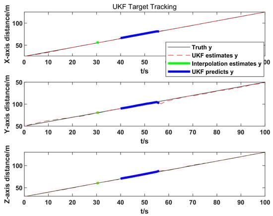 Figure 6 illustrates the 3D target tracking performance based on UKF and interpolation algorithm. The black solid line represents the target’s true motion trajectory, the red dashed line is the UKF estimated trajectory, the green solid line is the cubic interpolation estimated trajectory when the target experiences short-term occlusion, and the blue solid line is the estimated trajectory obtained solely using the UKF prediction process when the target experiences long-term occlusion. As can be seen from the figure, each segment of the estimated trajectory agrees well with the true trajectory, meeting the tracking requirements.