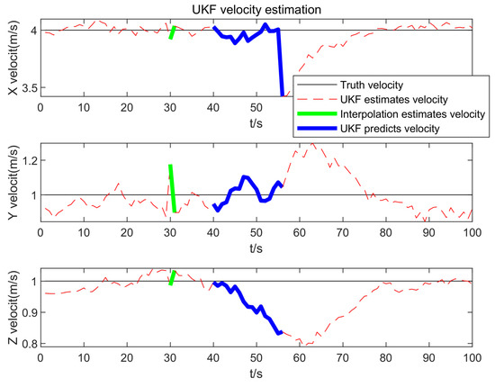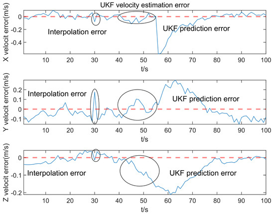 Figure 8 and Figure 9 demonstrate the velocity estimation performance of the proposed method. Its variation trend is largely similar to that of distance estimation. When observations are missing, the error sharply increases; however, it quickly converges after reacquisition, eventually settling within 0.2 . This further verifies the feasibility of the proposed method, enabling it to meet the tracking requirements for scenarios with occluded targets.