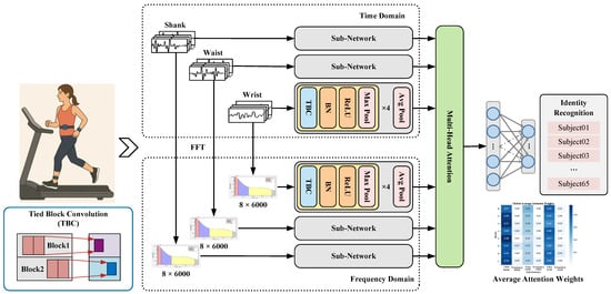 Previous studies on IMU-based gait identity recognition predominantly focused on time-domain feature extraction. While time-domain signals effectively capture short-term dynamics, they may ignore periodicity and frequency features cues that are highly discriminative for identity. Moreover, the relative contributions of sensor locations and time–frequency modalities have seldom been quantified under a unified framework.
