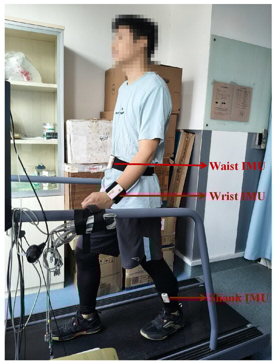 To simulate real-world walking scenarios in which individuals may walk at varying speeds, data collection was conducted on a motorized treadmill with three preset speed conditions: slow, normal, and fast paces. For each speed condition, data were recorded for a continuous 10 min interval, resulting in approximately 30 min of sensor data per participant. Short transitional periods were included between speed changes to minimize abrupt gait pattern shifts. The experimental setup is illustrated in Figure 2.