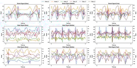 Figure 3 illustrates raw IMU signals acquired from the shank, wrist, and waist under slow, normal, and fast walking conditions, highlighting the variability of motion patterns across sensor positions and gait speeds. Clear variations in amplitude, temporal periodicity, and waveform complexity are evident, reflecting the influence of both sensor placement and locomotion speed on the recorded signals.