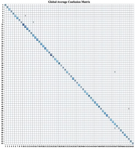 Figure 4 presents the gait identification results of the proposed TFAGNet on the 65-subject dataset, shown as a normalized confusion matrix derived from five-fold cross-validation. The matrix reveals that over 92% of predictions are concentrated along the diagonal, demonstrating the model’s strong classification capability. The remaining less than 8% of samples appear in off-diagonal positions, and these misclassifications are predominantly limited to a small subset of subjects. Such cases typically involve individuals whose gait signatures exhibit high inter-subject similarity, leading to occasional confusion. Despite these challenging instances, the high diagonal concentration and low misclassification rate indicate that TFAGNet maintains stable discriminative performance and robust generalization across diverse subjects in multi-class gait recognition.