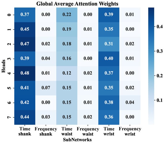 To quantitatively assess the contribution of different signal modalities and sensor placements, we visualized the global average attention weights across all attention heads and the six subnetworks, as shown in Figure 5. The attention heatmap demonstrates that time-domain features from the shank and wrist receive consistently higher weights, suggesting that these modalities contribute more significantly to identity recognition. Moreover, frequency-domain branches receive non-zero weights in most samples, indicating that the model leverages under moderate sensor noise.