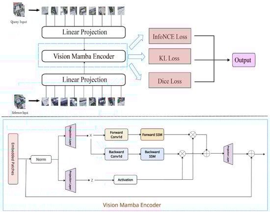 Currently, convolutional neural networks (CNNs) and Vision Transformers (ViTs) have achieved the state-of-the-art performance in the filed of cross-view geo-localization [6,7,8,9,10,11]. CNNs extract features through stacked convolutional operations, while ViTs model long-range dependencies via self-attention mechanisms. However, these models still exhibit limitations in cross-view geo-localization. Compared to general vision tasks, cross-view scenarios typically involve complex, multi-object, and multi-scale scenes. CNNs, limited by their local receptive fields, struggle to capture complex feature representations [12], while ViTs, despite their ability to model long-range dependencies, present significant challenges in model efficiency and memory usage due to their high complexity [13,14]. Recently, Mamba, a state-space model (SSM)-based approach [15], has emerged as a novel paradigm [16,17,18]. By introducing a selection mechanism to control information propagation along sequence dimensions, Mamba achieves long-range dependency modeling with linear computational complexity. While Mamba has shown success in remote sensing tasks closely related to cross-view geo-localization [19,20], its application as a backbone model in cross-view geo-localization remains underexplored. Furthermore, most existing methods predominantly employ Triplet Loss or its variants [21,22], which may overemphasize abundant negative samples in class-imbalanced scenarios, causing difficulties in learning the features of positive samples. Dice Loss, a specifically used loss function in medical image segmentation, focuses more on foreground regions and can better address class imbalance issues [23]. It can be leveraged as a supplementary loss for cross-view geo-localization.