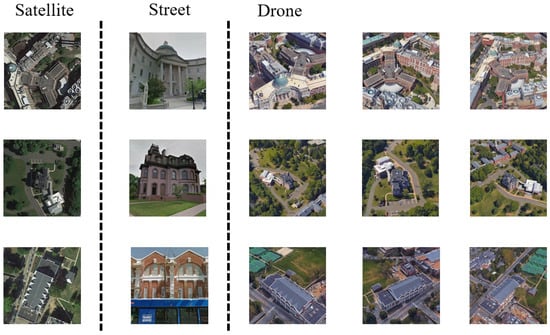 Our work primarily focuses on matching drone views and satellite views. Therefore, we train and evaluate our method on a public large-scale geo-localization dataset widely used in recent studies, namely, University-1652 [30]. This dataset contains images from three platforms, including ground camera, drone, and satellite images of 1652 university buildings from 72 universities around the world. It is widely used in cross-view geo-localization research, with the task of matching drone views to corresponding satellite images and vice versa. Another notable feature of this dataset is that some buildings in the test set have only satellite images without corresponding drone views. Our model is trained on the training set, and all reported results are on the official test subset. In addition to the recall rate, the average precision (AP) is also indicated. Figure 2 shows some samples of images with different views from the University-1652 dataset.