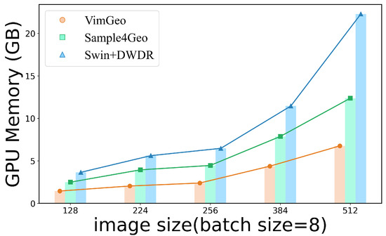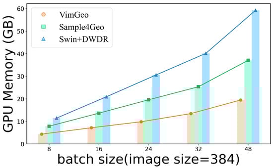 GPU memory efficiency comparison. Comparison of cross-view geo-localization frameworks shows our model maintains better memory efficiency. VimGeo’s GPU memory usage decreases notably with higher image resolutions during batch inference.