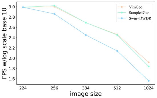 Comparison of inference speed between recent approaches with different framework and our model. We performed batch inference and logarithmic-scale FPS benchmark tests on architectures with the same backbone. At smaller resolutions, VimGeo achieves performance comparable to Sample4Geo. As the input image resolution increases, VimGeo shows higher FPS.