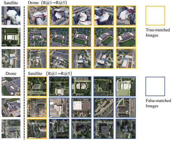 Visualization results of satellite-view and drone-view images processed by our method. The first three rows display the top-5 retrieval results of drone-view target localization on University-1652. The last three rows display the top-5 retrieval results of drone navigation on University-1652. The yellow box indicates a correctly matched image, and the blue box indicates a falsely matched image.
