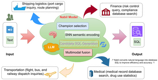 As shown in the Nabil model application scenario diagram in Figure 1, the Nabil model, which we designed based on brain-inspired computing technology and a large language model, will be deployed in computing centers within industrial environments. The user side and the application side access the Nabil model through the network layer. User input includes voice and natural language text. Voice is converted to text by third-party software before being entered into the Nabil model. The Nabil model consists of a semantic encoding layer, a multimodal feature fusion layer, a candidate SQL generation layer, and a champion model. The Nabil model outputs the corresponding SQL based on the received text. Because the Nabil model can address issues such as natural language ambiguity, database and knowledge graph isolation, SQL dialect normalization, and slow manual querying, it can be widely applied in various fields, including automobile transportation, shipping, water transport, finance, education, and healthcare. For example, users can use natural language to plan routes and query traffic conditions in real time; passengers can use natural language to query flight status, delays, and gate information; crew members can use natural language to query routes, weather, and navigation status in real time; users can use natural language to query risk indicators, market trends, and unusual transactions; students can use spoken language to query personalized learning paths and recommended content; and doctors can use natural language to query disease diagnosis information and assistance recommendations. The examples provided are relevant to possible specificities within the individual proposed areas of use, such as the aspect defined by safety regulations in air transport, or the high uncertainty in medicine and the GDPR.