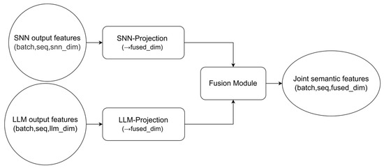 In the spiking neural network structure of Figure 2, the standard embedding method is first used to obtain the word vector of the input natural language. Next, pulse coding is used to convert the continuous embedding vectors into pulse trains. Then, Leaky Integrate-and-Fire (LIF) neurons are used to capture the temporal information of the language. The temporal feature sequences are aggregated to obtain a stable feature representation. Finally, a stable and refined pulse feature sequence is output. Because a multi-layered structure enhances feature extraction, the spiking recurrent neuron layer is stacked, with each layer consisting of LIF recurrent neurons. In the study of the Nabil model, a multimodal feature fusion layer was designed to align and fuse the fine-grained spatiotemporal features encoded by the spiking neural network with the high-level semantic features encoded by the LLM in the same space, thereby obtaining a more expressive and robust joint semantic feature. The structure of the multimodal feature fusion layer is shown in Figure 3.