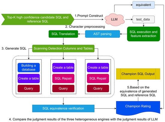 As shown in Figure 5, the top-K high-confidence SQL candidates and reference SQL output by the SQL candidate generation layer serve as input to the champion model. The champion model enables the large language model to generate test data, providing both judgment results and justification. The test data is first parsed into an abstract syntax tree, then translated and formatted. SQL is generated based on the column and table information obtained through scan checks. In the DuckDB engine, judgment results are output after the database is created, the table is created, and the query is executed. In the PostgreSQL and MySQL engines, judgment results are output after creating the table, repairing the SQL, and executing the query. During execution, if the judgment results from the three engines and the large language model are consistent, the champion SQL is directly output. If an engine error occurs, the champion SQL is output based on the judgment result of the large language model.