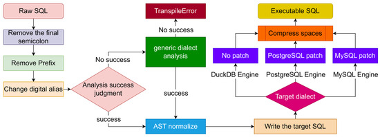 In Algorithm 2, the primary purpose of pre-cleaning is to remove the trailing semicolon and temporary column prefixes and to change the pure numeric alias to a legal identifier, thereby avoiding parsing errors. The method used in the syntax tree abstraction process is to parse with the target dialect first and then fall back to the more relaxed “generic” dialect. In SQL dialect gap repair, the operation for the MySQL engine involves deleting NULLS LAST/FIRST and window RANGE BETWEEN, changing Boolean literals to integers, and replacing the missing function names in MySQL. The operation for the PostgreSQL engine involves replacing CONCAT with || for splicing text, numbers, comparisons, additions, and explicit type conversions and uniformly using NUMERIC in aggregate functions. Because DuckDB uses a syntax close to PostgreSQL and has good compatibility, the operation for the DuckDB engine is to retain duckdb_minor_fix as an extension hook. Finally, the algorithm compresses redundant spaces, removes leading and trailing blanks, and returns SQL that can be directly executed in the target engine, equivalent to the original query logic.