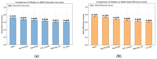 In Figure 7a, the Nabil model outperforms the runner-up by approximately 4.4 percentage points, demonstrating its superior generalization and robustness when handling complex real-world BIRD database scenarios. Figure 7b also shows that the Nabil model leads in this metric, with a significant performance advantage over other models, fully demonstrating its accuracy, efficiency, and reliability in real-world applications.