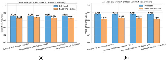 The proposed Nabil model consists of an NL semantic encoding layer, a multimodal feature fusion layer, a candidate SQL generation layer, and a champion screening layer. To gain a deeper understanding of the proposed Nabil model, we conducted ablation comparison experiments on the Nabil model. Four sets of experiments were conducted. The first set of comparative experiments compared the complete Nabil model with the Nabil model without the NL semantic encoding layer. The second set of comparative experiments compared the complete Nabil model with the Nabil model without the multimodal feature fusion layer. The third set of comparative experiments compared the complete Nabil model with the Nabil model without the candidate SQL generation layer. The fourth set of comparative experiments compared the complete Nabil model with the Nabil model without the champion screening layer. The ablation comparison experiments also used EX and VES to analyze the experimental results. The specific experimental results are shown in Figure 8.