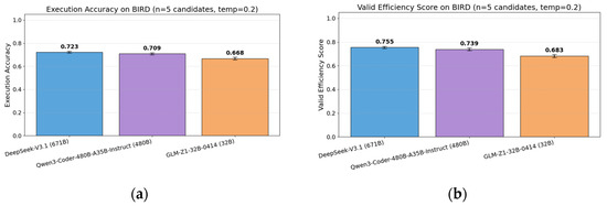 To ensure fairness and reproducibility, we standardized the settings for comparative experiments involving three large language models (DeepSeek-V3.1, Qwen3-Coder-480B-A35B-Instruct, and GLM-Z1-32B-0414). All experiments were conducted using the same dataset and database engine, consistent prompt templates (structured, few-shot, schema-aware, task decomposition), and uniform generation parameters (temperature = 0.2, top_p = 0.9, max_tokens = 1024, candidate number n = 5). To ensure statistical significance and reproducibility, each model was independently run three times, and the mean and standard deviation of the execution accuracy (EX) and valid efficiency score (VES) were calculated. The experimental results are shown in Figure 9.