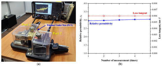 (a) Measurement setup using the Keysight 85072A split-cylinder resonator to characterize the polymer under test (PUT), and (b) extracted relative permittivity and loss tangent of the standard white-colored resin from Anycubic.