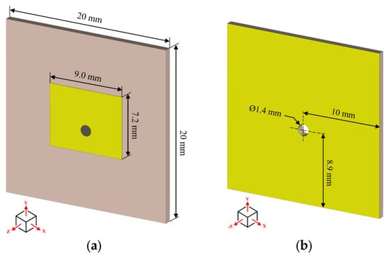 The geometry of the microstrip patch antenna: (a) the front perspective view of the 10-GHz patch antenna, and (b) the back perspective view of the 10-GHz patch antenna.