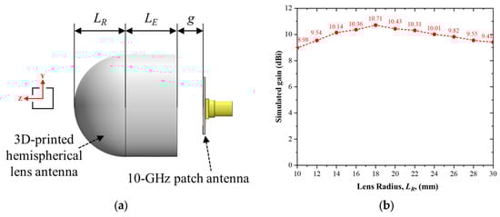 (a) Side view of the hemispherical lens integrated with the 10-GHz patch antenna, and (b) simulated realized gain as a function of lens radius, LR, varied from 10 mm to 30 mm in 2 mm increments.